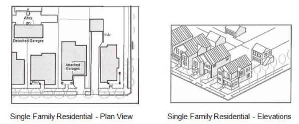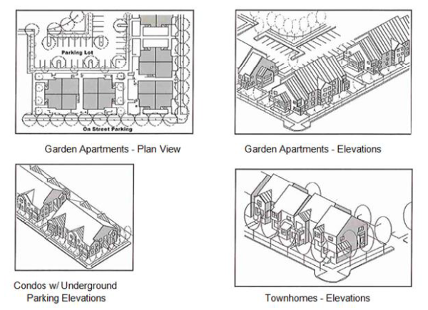 | Land Use | Commercial, Office & Vertical Mixed Use or residential flats | Condos, Town-homes, single purpose apartments | Single-family, duplexes, twin homes, & 4 unit buildings | Civic Uses & other stand-alone uses |