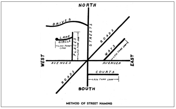 Names of new streets shall not duplicate or be similar to existing dedicated streets. New streets which are extensions of or in alignment with existing streets shall bear the name of the existing streets. All new streets shall be named as shown on the plan titled "Method of Street Naming," which follows the text of these Subdivision Regulations as Appendix I.