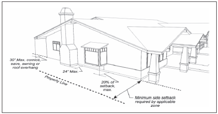 Allowed Encroachments into Setbacks and Build-to Lines. An architectural feature attached to a principal structure may extend beyond the wall of the structure and into a required front, side, or rear setback in compliance with Table 3.1-1 (See also Figure 3-4). These requirements do not apply to accessory structures, which are instead subject to Section 2.10, Accessory Uses and Structures.