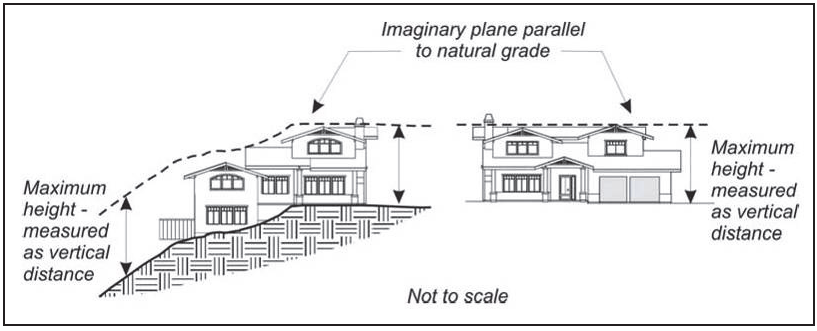 The maximum allowable height shall be measured as the vertical distance from the natural grade of the site to an imaginary plane located at the maximum allowed number of feet above and parallel to the grade (See Figure 3-5). The location of natural grade shall be determined by the city planner, and shall not be artificially raised to gain additional building height.