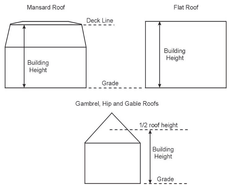 Where specified in feet, building height shall be measured as the vertical distance from grade at the base of the structure to (See Figure 3-6):