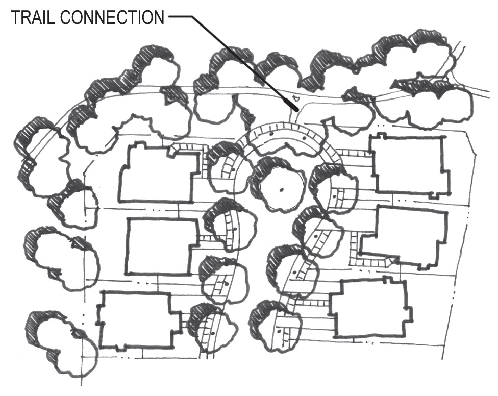 When culs-de-sac are necessary, trails will be required where culs-de-sac are planned to connect the ends of the streets together, to other streets, and/or to other developments, as applicable (See Figure 3-30). Trails used to comply with these standards shall conform to all of the following criteria: