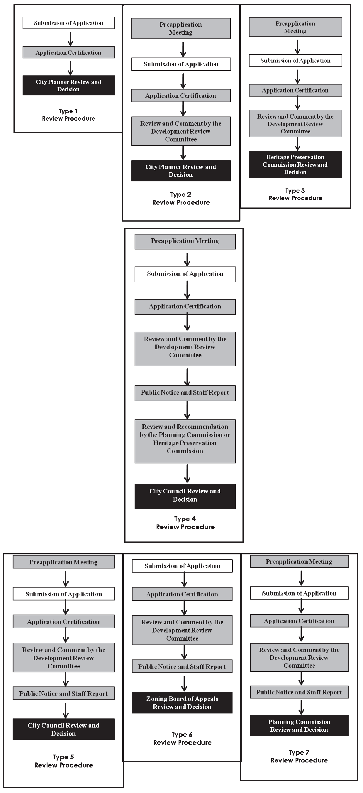 There are seven different types of procedural reviews with different variations on the review bodies. These seven procedures are defined in Section 8.4, Summary of Application and Review Procedure Types.
