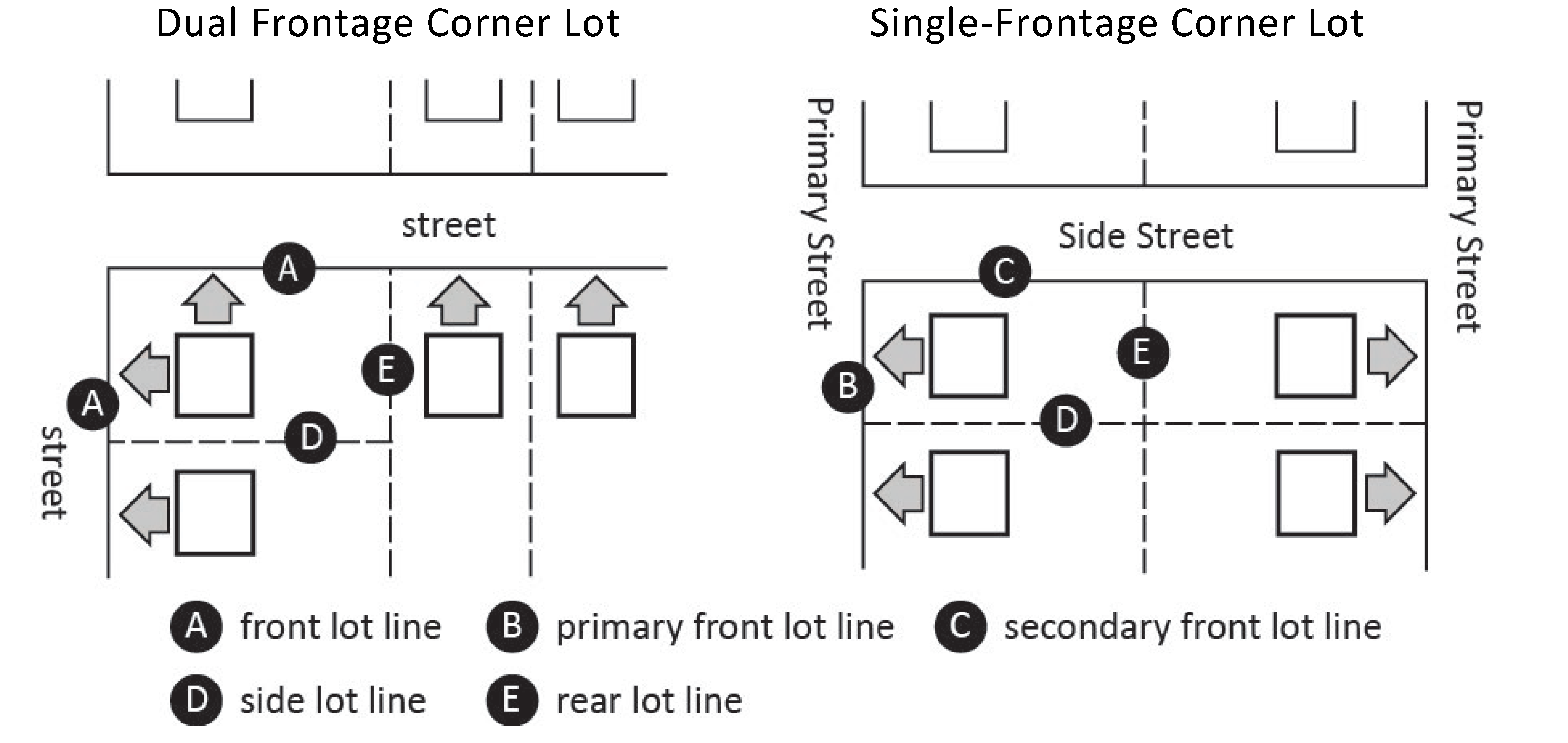 PRIMARY FRONT YARD: The yard of a Single-Frontage Corner Lot that corresponds with the front yard of the adjoining interior lot.