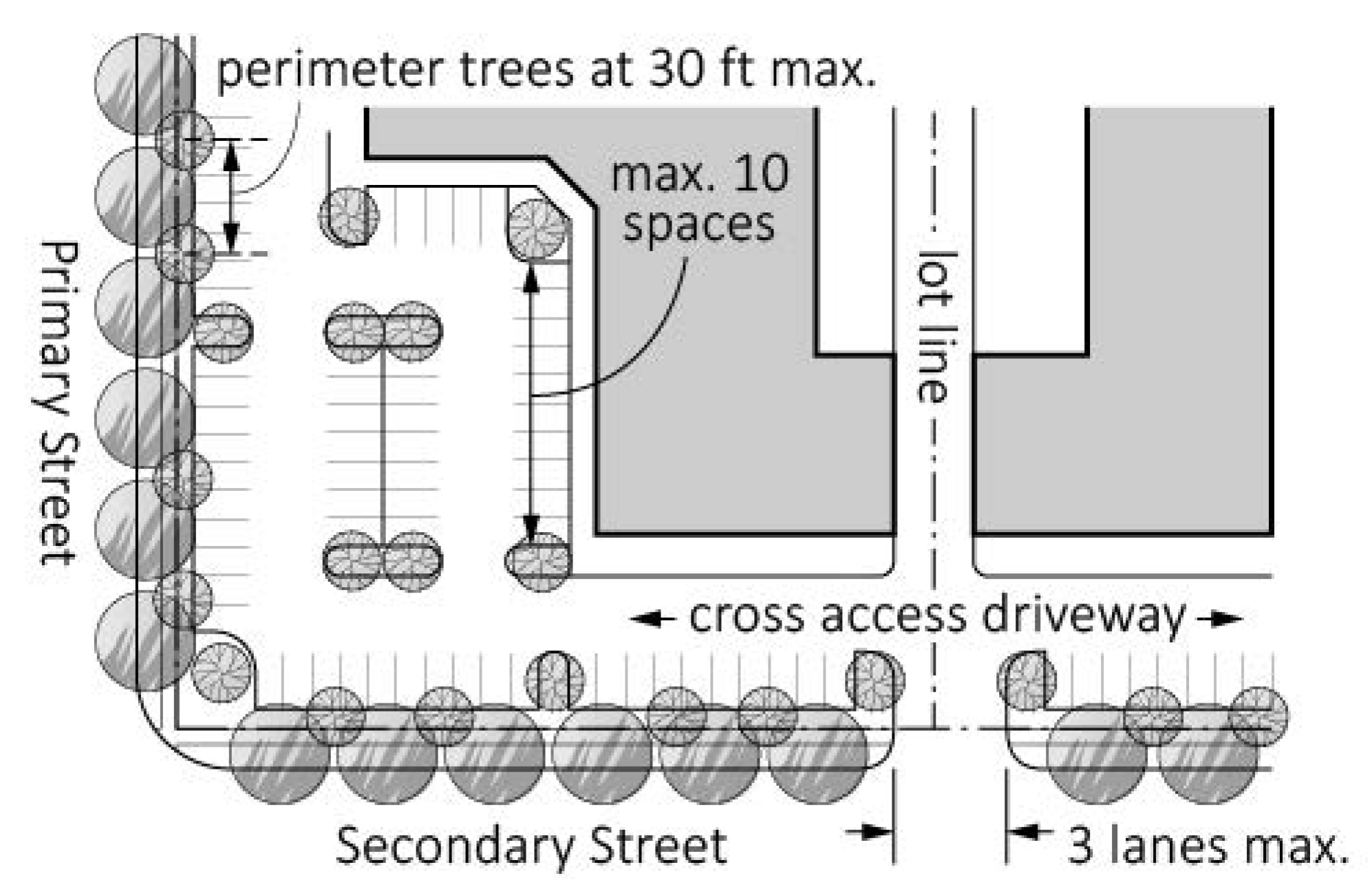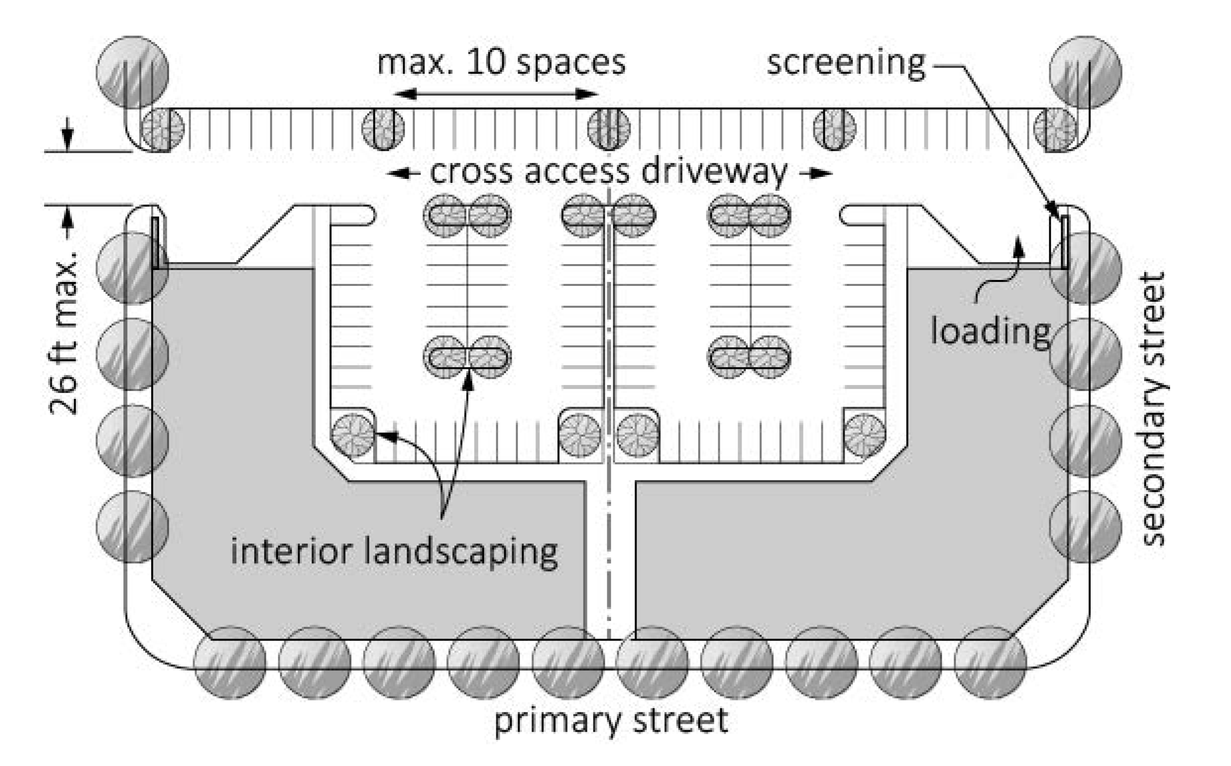 Vehicular Access. To preserve the capacity of existing streets and promote vehicular and pedestrian safety, the number and spacing between driveways along streets must be limited. Access to parking areas must be from alleys whenever practicable. Driveways must be along secondary streets rather than primary streets, whenever possible. Driveways must be located along the edge of the lot. Shared access driveways must be provided along property boundaries when practicable. Multiple adjacent driveways must be avoided. No more than one driveway is allowed per property unless the parking lot's size and traffic projections warrant a second driveway as determined by the City Engineer.
