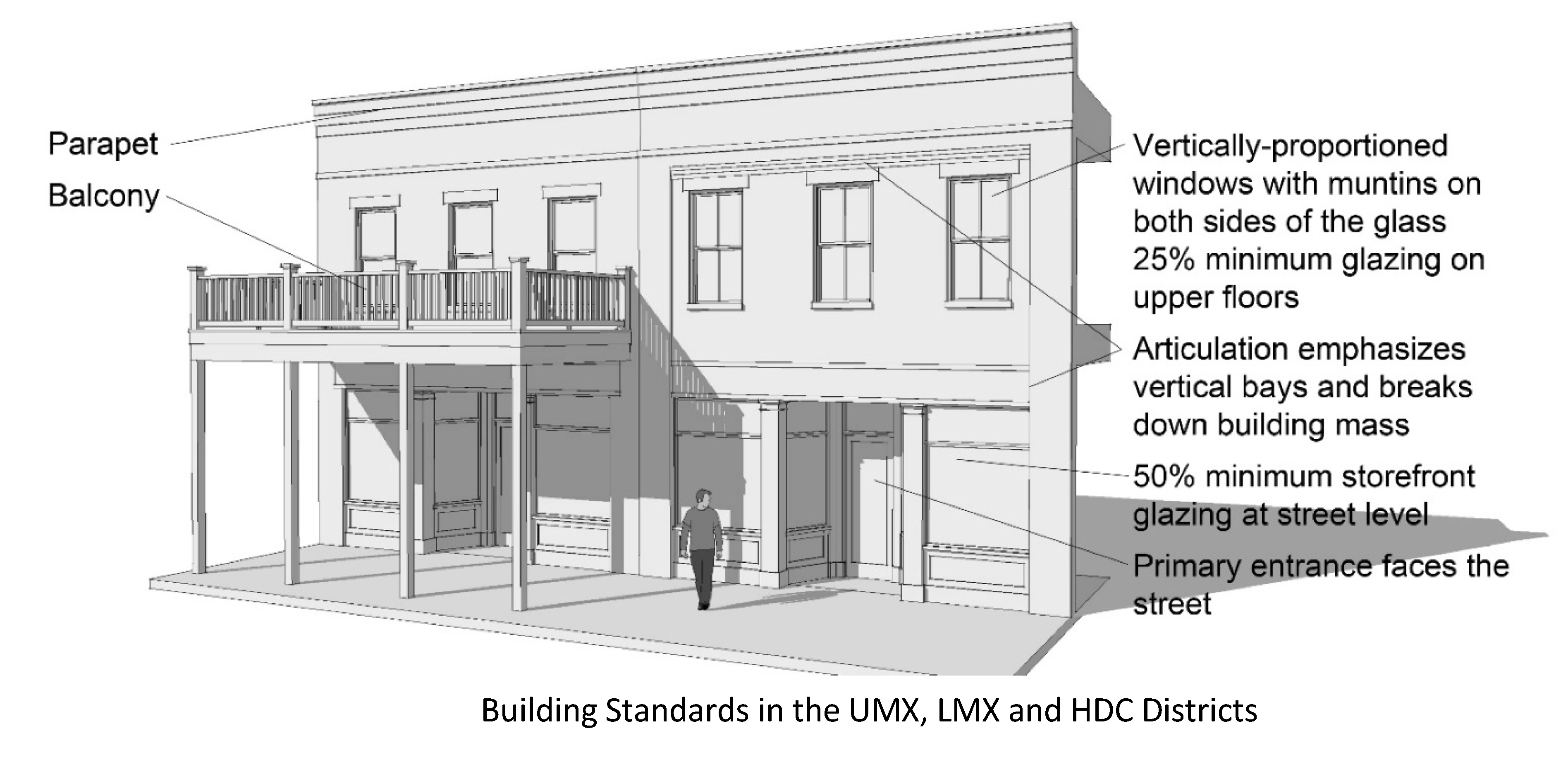 Glazing: Glass anywhere on the street façade may not be reflective or heavily tinted.