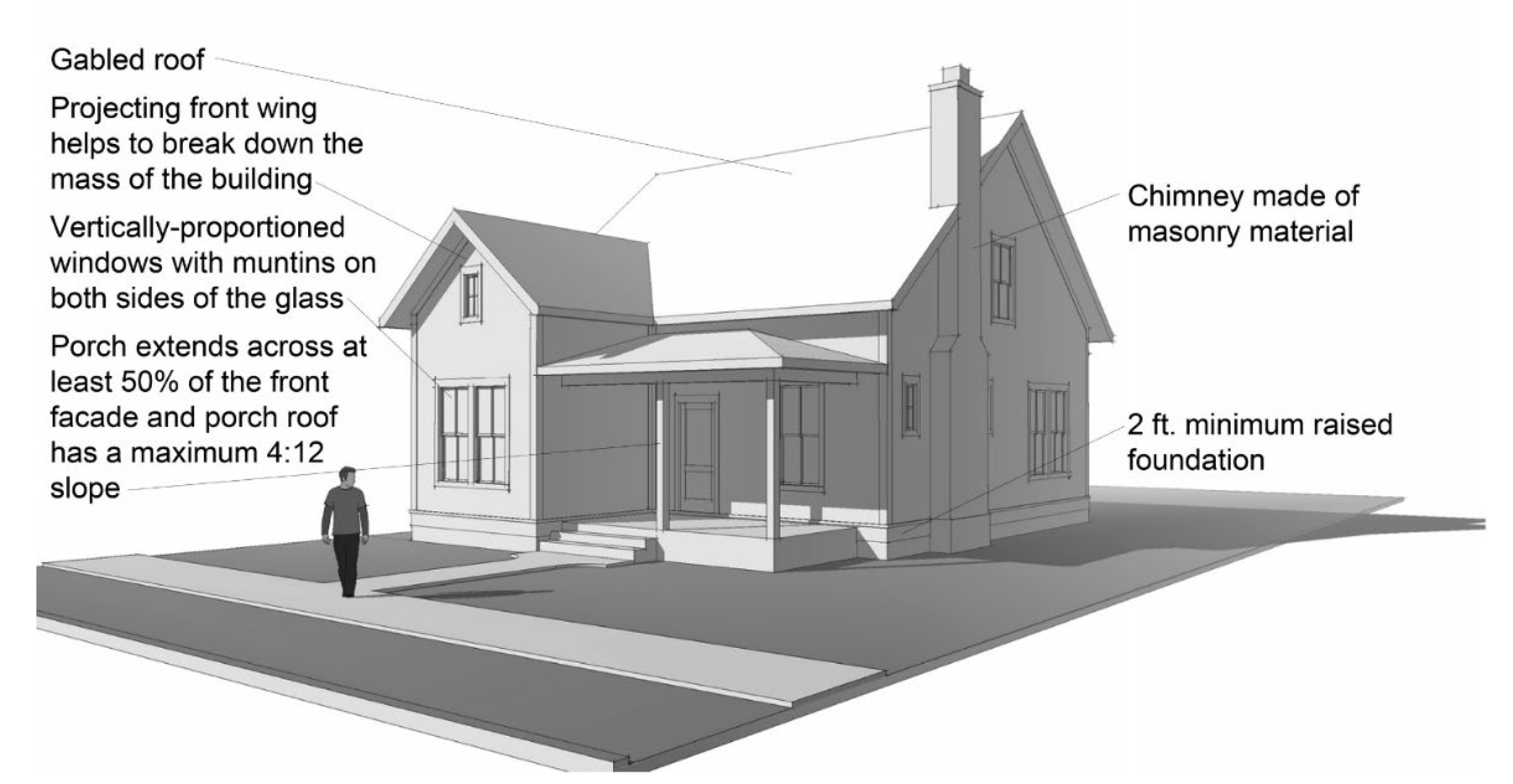 All buildings must have a front porch except for building styles or types historically found in the district that traditionally lacked a porch.