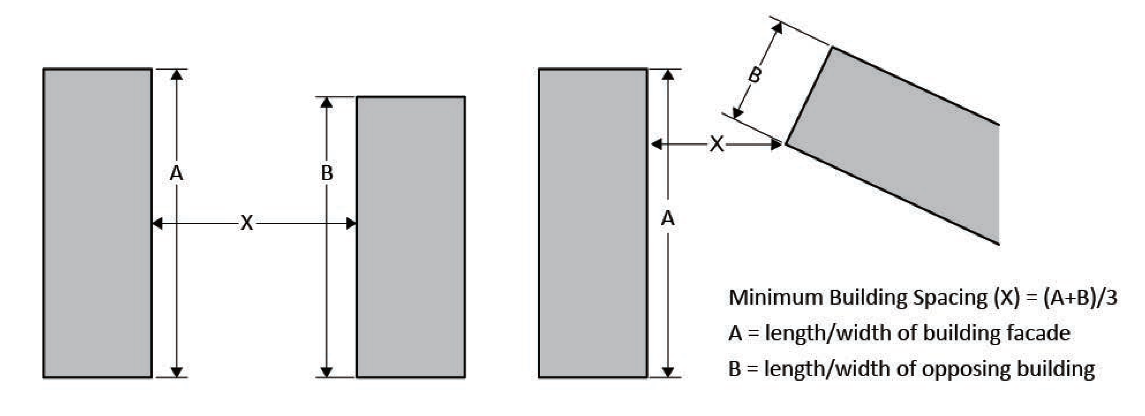 Minimum Setbacks: Each tower must be set back from all property lines a distance equal to 50% of its height. When site is a leased portion of a larger parcel, setbacks are measured from the property lines, not the leased site. Maintenance and equipment buildings must meet the setback requirements as specified for the applicable district.