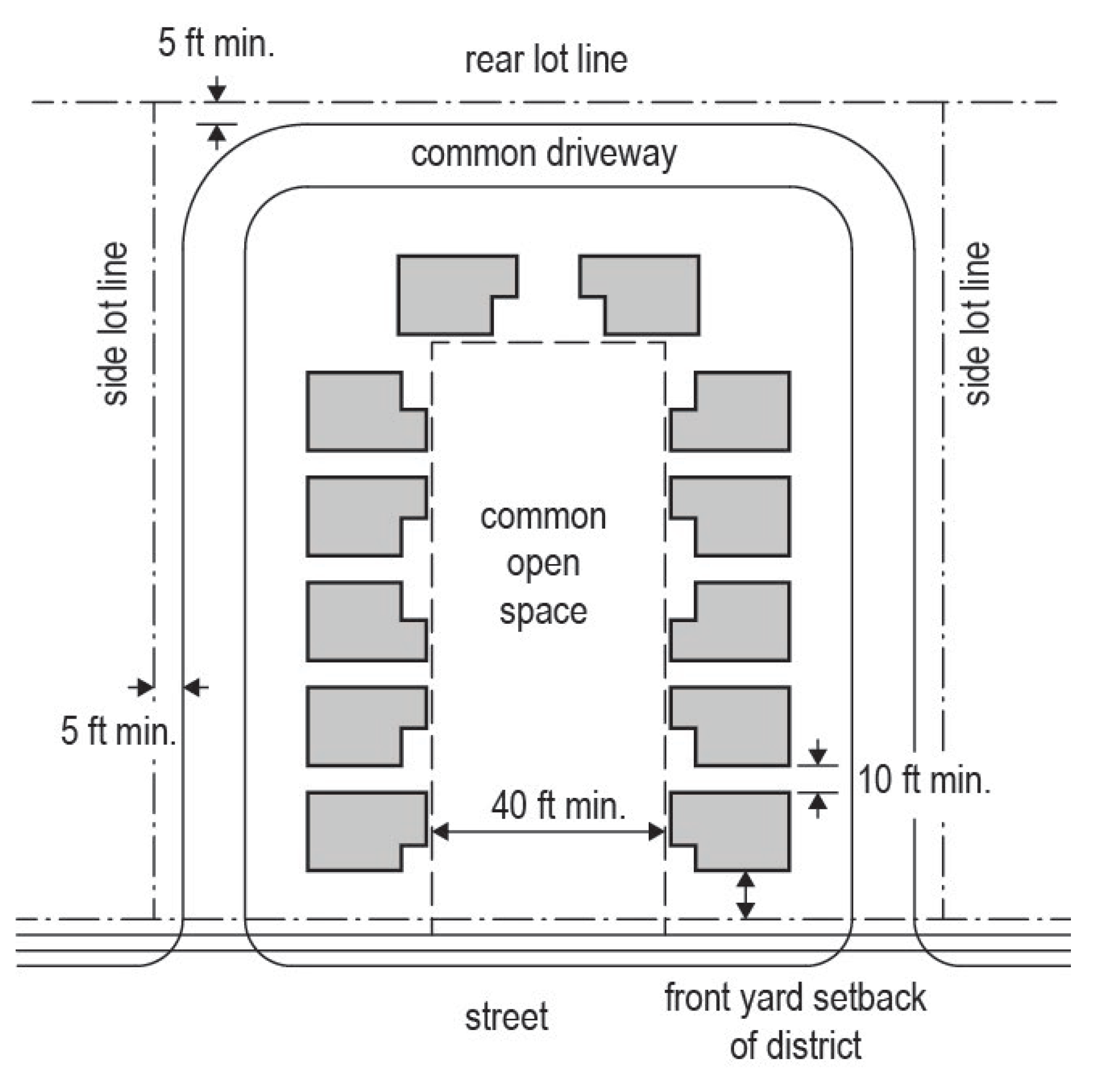 Townhouses must have individual entrances, not used by other units, in the front and rear. They must be placed on their own lots unless developed in condominium form.
