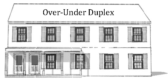 Generally. The duplex housing type consists of two single-family dwelling units located in a single building. Illustrative duplex buildings are shown in Figure 9-3-104A, Illustrative Duplex Buildings.