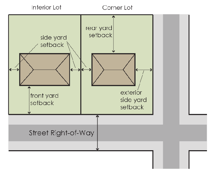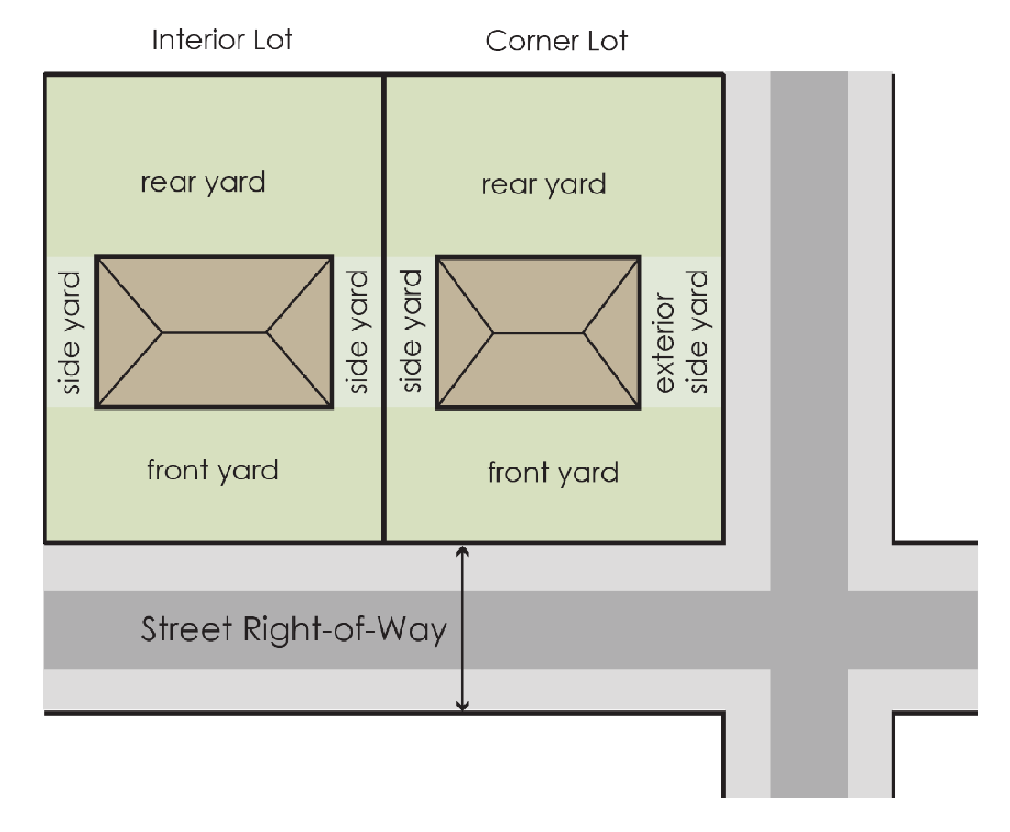 Yard, rear. A required rear yard is an open area extending across the full width of the lot, the uniform depth of which is the minimum prescribed horizontal setback distance measured at right angles to the rear lot line, describing an unoccupied space between the rear lot line and the nearest line of the principal building. In the case of a corner lot, the rear yard may be opposite either street frontage, but there shall be only one rear yard.