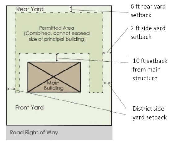 Detached accessory buildings shall be set back a minimum of ten feet from the principal building.