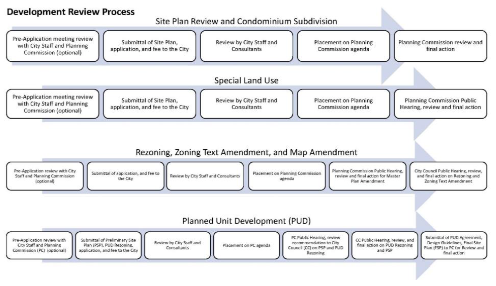 The process for application and review by the city for site plan review, special land use approvals, conditional land use approvals, planned unit developments (PUDs), condominium developments, text amendments to this ordinance, and rezonings of land is shown on figure 2.2 development approval process. Submittal dates, application forms, and information on fee requirements are available at the city offices.