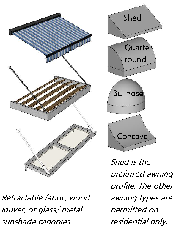 Awnings shall be of traditional, shed design and shall be made from fabric or metal materials and not from plastic, vinyl, or fiberglass.
