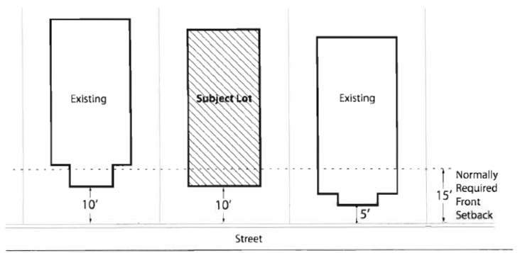 5. In the RU-1 Zone, if adjacent lots abutting the side lot lines of the subject lot both contain principal Residential Facilities that have front setbacks with a depth of less than the minimum required in this Chapter, the minimum front setback shall be reduced for buildings and other structures on the subject lot up to a line parallel to the front lot line and extended from the most forward projection of the principal Residential Facility on the adjacent lots having the deeper front setback depth, provided such projection is enclosed, has a wall height of at least eight (8) feet, and has a width of at least five (5) feet. In the case of a corner lot, or lot that has one or more vacant parcels next to it, this same principal shall apply if the nearest non-vacant lot to each side of a corner lot, or to each side of a lot that has one or more vacant parcels next to it, have less than the minimum front setback required in this Chapter (see Illustration for Table 17.19.03 [Additional Regulation 5], below). Also, see Section 17.108.130 for allowed projections into setbacks.