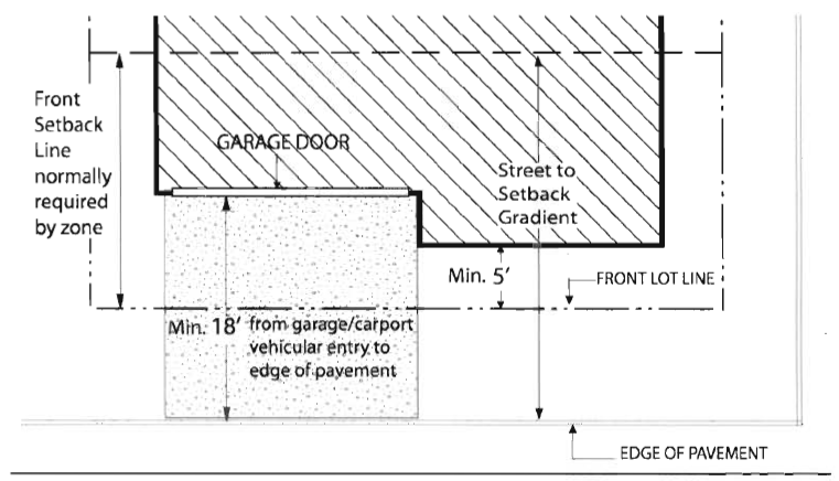 6. In all RU Zones, the minimum front setback otherwise required by the applicable individual zone regulations shall be reduced to five (5) feet on any lot with a street-to-setback gradient that exceeds twenty percent (20%), provided, however, that the minimum length of any driveway or parking pad accommodating one or more parking spaces between the front property line and the front building elevation shall be at least eighteen (18) feet (see Illustration for Table 17.19.03 [Additional Regulation 6], below). See Section 17.108.130 for allowed projections into setbacks.
