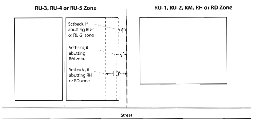 8. Wherever an interior side lot line of any lot located in the RU-3, RU-4, or RU-5 Zone abuts an interior side lot line of any lot located in an RH or RD Zone, a side setback of six (6) feet is required. In the case where an interior side lot line of any lot located in the RU-3, RU-4, or RU-5 Zone abuts an interior side lot line in an RM or RU-1 Zone, a side setback of four (4) feet is required (see Illustration for Table 17.19.03 [Additional Regulation 8] below).
