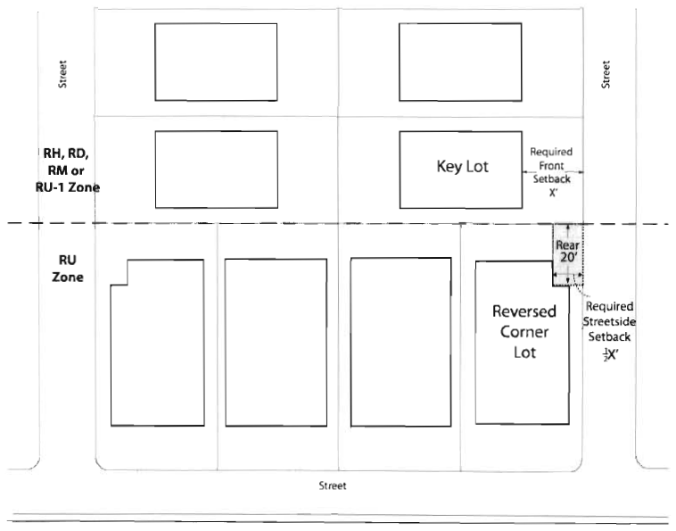 9. When the rear yard of a reversed corner lot abuts a key lot that is in an RH, RD, or RM Zone, the required street side yard setback in the rear ten (10) feet of the reversed corner lot is one-half (½) of the minimum front yard required on the key lot, but shall not be required to exceed four (4) feet in width if it would reduce to less than twenty-five (25) feet the buildable width of any corner lot (see Illustration for Table 17.19.03 [Additional Regulation 9], below).