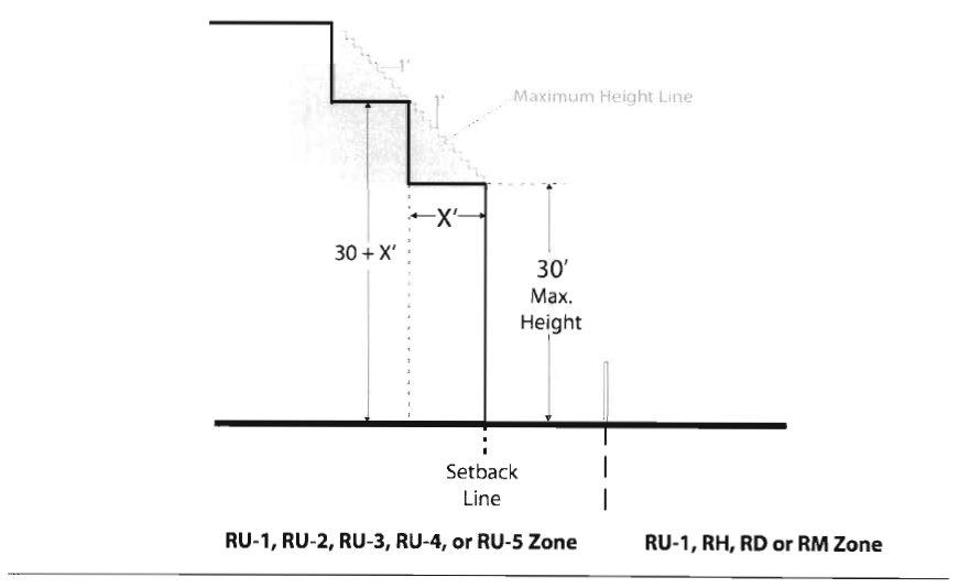 2. Buildings in the RU Zones shall have a thirty (30) foot maximum height at the setback line along any rear or interior side lot line that abuts a lot in an RH, RD, or RM Zone; if the principal building on the abutting lot has a height of thirty (30) feet or less, this maximum height may increase one (1) foot for every foot of distance away from this setback line. If the principal building on the abutting lot has a height of greater than thirty (30) feet, the maximum height shall increase two (2) feet for every foot away from the applicable setback line. Also, see Section 17.108.030 for allowed projections above height limits and Section 17.108.020 for increased height limits in certain situations.