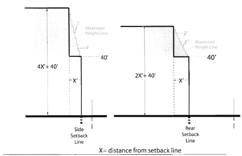 15. In the RU-2 and RU-3 Zone, a building may only exceed forty-five (45) feet in height up to the maximum height if each portion above forty-five (45) feet is set back from the inner line of any minimum side setback, a minimum horizontal distance equal to one (1) foot for each four (4) feet by which it extends above the height of forty-five (45) feet; and set back from the inner line of any minimum rear yard, a minimum horizontal distance equal to one (1) foot for each two (2) feet by which it extends above the height of forty-five (45) feet, provided, however, that such setback from the inner line of the any minimum rear yard need not exceed twenty (20) feet (see Illustration for Table 17.19.03 [Additional Regulation 15], below).