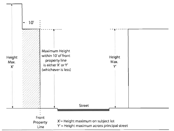 1. The maximum height within ten (10) feet of the front property line is either the height limit on the subject lot shown in the above table or the height maximum for the height area of the parcel directly across the principal street, whatever is less (see Illustration for Table 17.19.04 [Additional Regulation 1], below).