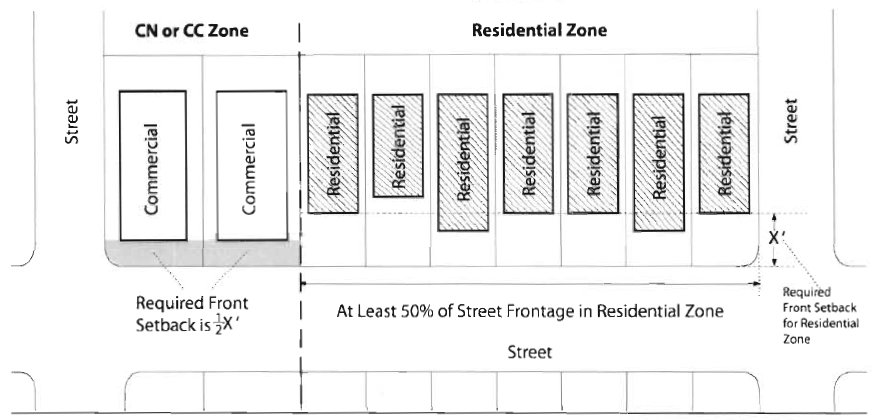 2. If fifty percent (50%) or more of the frontage on one (1) side of the street between two (2) intersecting streets is in any Residential Zone and all or part of the remaining frontage is in any Commercial or Industrial Zone, the required front setback of the commercially or industrially zoned lots is one-half (½) of the minimum front setback required in the Residential Zone. If fifty percent (50%) or more of the total frontage is in more than one Residential Zone, then the minimum front setback on the commercially or industrially zoned lots is one-half (½) of that required in the Residential Zone with the lesser front setback (see Illustration for Table 17.33.03 [Additional Regulation 2]). Also, see Section 17.108.130 for allowed projections into setbacks.