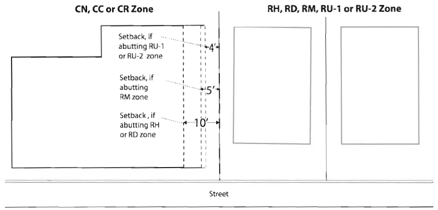 4. Wherever an interior side lot line abuts an interior side lot line of any lot located in an RH or RD Zone, a side setback of six (6) feet is required. In the case where an interior side lot line abuts an interior side lot line in a RM Zone, the setback of the abutting portion of its side lot line is five (5) feet. In the case where an interior side lot line abuts an interior side lot line of any lot located in an RU-1 or RU-2 Zone, a side setback of four (4) feet is required (see Illustration for Table 17.33.03 [Additional Regulation 4], below). Also, see Section 17.108.130 for allowed projections into setbacks.