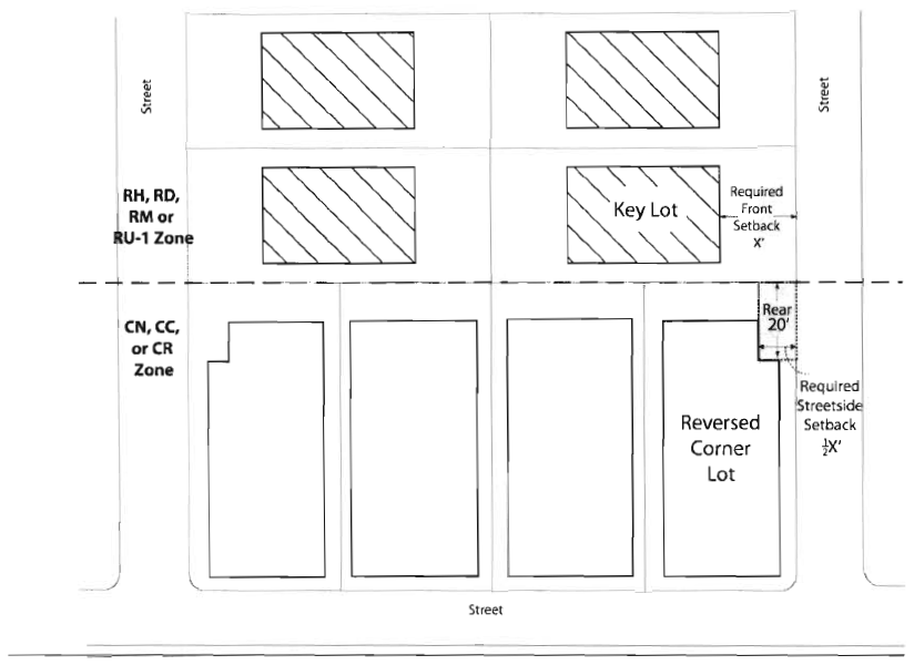 6. When the rear yard of a reversed corner lot abuts a key lot that is in an RH, RD, or RM Zone, the required street side yard setback in the rear ten (10) feet of the reversed corner lot is one-half (½) of the minimum front yard required on the key lot, but shall not be required to exceed four (4) feet in width if it would reduce to less than twenty-five (25) feet the buildable width of any corner lot (see Illustration for Table 17.33.03 [Additional Regulation 6], below). Also, see Section 17.108.130 for allowed projections into setbacks.