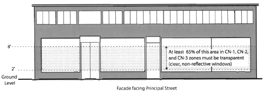 9. This percentage of transparency is only required for principal buildings that include ground floor Nonresidential Facilities, and only applies to the facade facing the principal street. The regulations only apply to facades located within twenty (20) feet of a street frontage. The area of required transparency is between two (2) feet and nine (9) feet in height of the ground floor and must be comprised of clear, nonreflective windows that allow views out of indoor activity space, or lobbies (see Illustration for Table 17.33.03 [Additional Regulation 9], below). Areas required for garage doors shall not be included in the calculation of facade area (see Additional Regulation 12 for limitations on the location of parking access). Glass block does not qualify as a transparent window. Exceptions to this regulation may be allowed by the Planning Director for unique facilities such as convention centers, gymnasiums, parks, gas stations, theaters and other similar facilities.