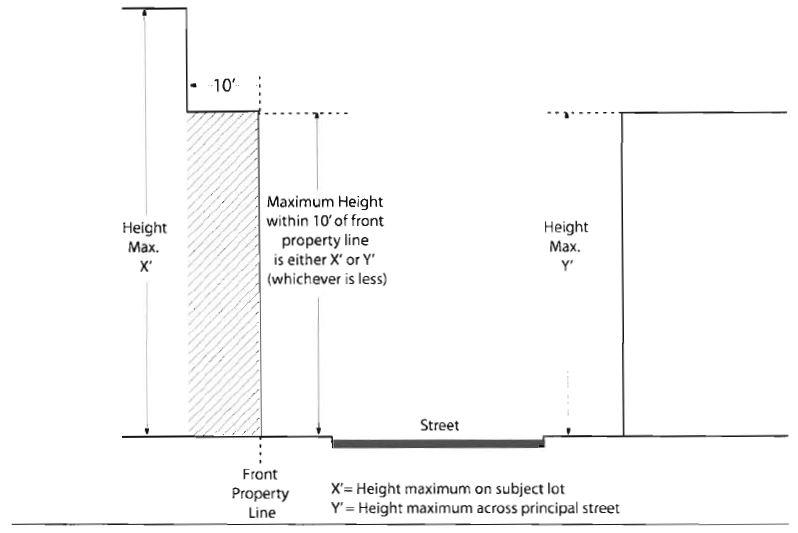1. The maximum height within ten (10) feet of the front property line is either the height limit on the subject lot shown in the above table or the height maximum for the height area of the parcel directly across the principal street, whatever is less (see Illustration for Table 17.33.04 [Additional Regulation 1], below).