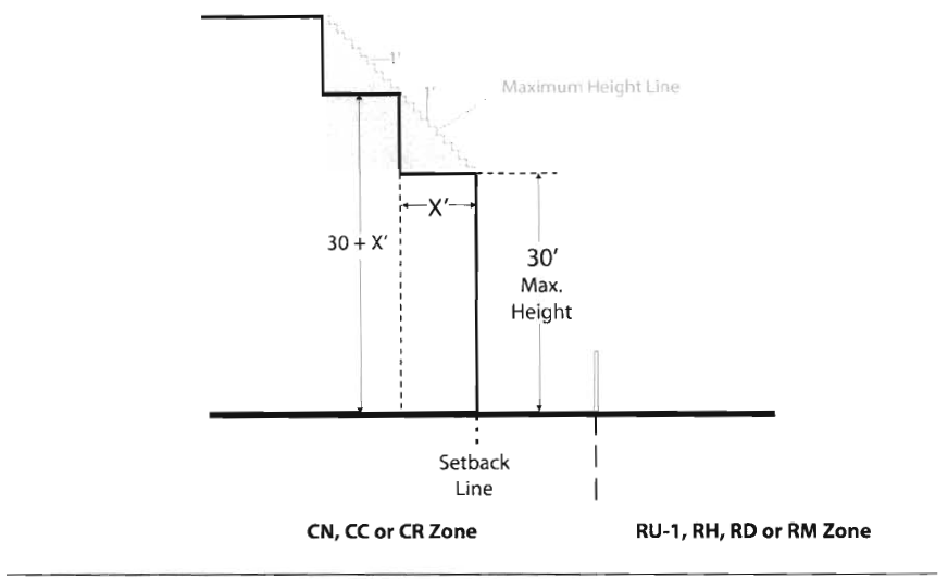 2. Buildings in the CN Zones shall have a thirty (30) foot maximum height at the setback line associated with any rear or interior side lot line that abut a lot in an RH, RD, or RM Zone; if the principal building on the abutting lot has a height of thirty (30) feet or less, this maximum height shall increase one (1) foot for every foot of distance away from this setback line. If the principal building on the abutting lot has a height of greater than thirty (30) feet, the maximum height shall increase two (2) feet for every foot away from the applicable setback line (see Illustration for Table 17.33.04 [Additional Regulation 2], below). Also, see Section 17.108.030 for allowed projections above height limits and Section 17.108.020 for increased height limits in certain situations.
