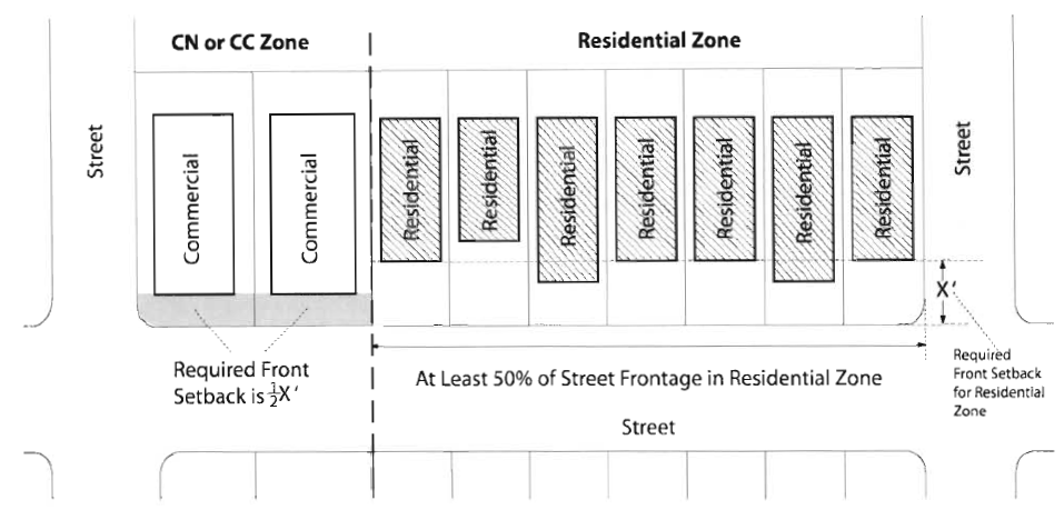 2. If fifty percent (50%) or more of the frontage on one side of the street between two intersecting streets is in any Residential Zone and all or part of the remaining frontage is in any commercial or industrial zone, the required front setback of the commercially or industrially zoned lots is one-half (½) of the minimum front setback required in the Residential Zone. If fifty percent (50%) or more of the total frontage is in more than one Residential Zone, then the minimum front setback on the commercially or industrially zoned lots is one-half (½) of that required in the Residential Zone with the lesser front setback (see Illustration for Table 17.35.03 [Additional Regulation 2], below).