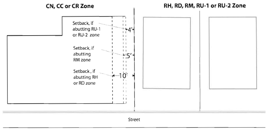 4. Wherever an interior side lot line abuts an interior side lot line of any lot located in an RH or RD Zone, a side setback of six (6) feet is required. In the case where an interior side lot line abuts an interior side lot line in an RM Zone, the setback of the abutting portion of its side lot line is five (5) feet. In the case where an interior side lot line abuts an interior side lot line of any lot located in an RU-1 or RU-2 Zone, a side setback of four (4) feet is required (see Illustration for Table 17.35.03 [Additional Regulation 4], below). Also, see Section 17.108.130 for allowed projections into setbacks.