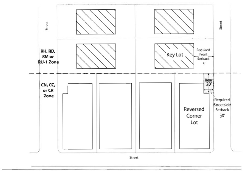6. When the rear yard of a reversed corner lot abuts a key lot that is in an RH, RD, or RM Zone, the required street side yard setback in the rear ten (10) feet of the reversed corner lot is one-half (½) of the minimum front yard required on the key lot, but shall not be required to exceed four (4) feet in width if it would reduce to less than twenty-five (25) feet the buildable width of any corner lot (see Illustration for Table 17.33.03 [Additional Regulation 6], below). Also, see Section 17.108.130 for allowed projections into the setbacks.