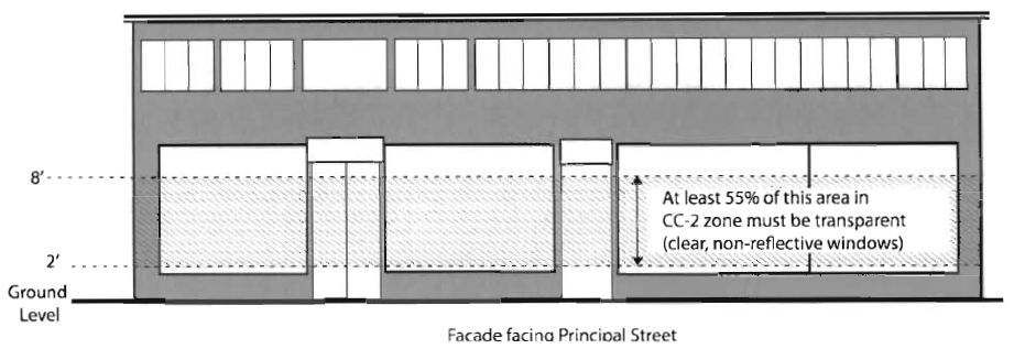 12. For the construction of new principal buildings in the CC-2 Zone, ground level parking spaces, locker areas, mechanical rooms, and other non-active spaces shall not be located within thirty (30) feet of the principal street frontage, except for incidental entrances to such activities elsewhere in the building. Exceptions to this regulation may be permitted by the Planning Director for non-active spaces that cannot be feasibly placed in other locations of the building. Driveways, garage entrances, or other access to parking and loading facilities may be located on the ground floor of this area as regulated by Additional Regulation 11, above.