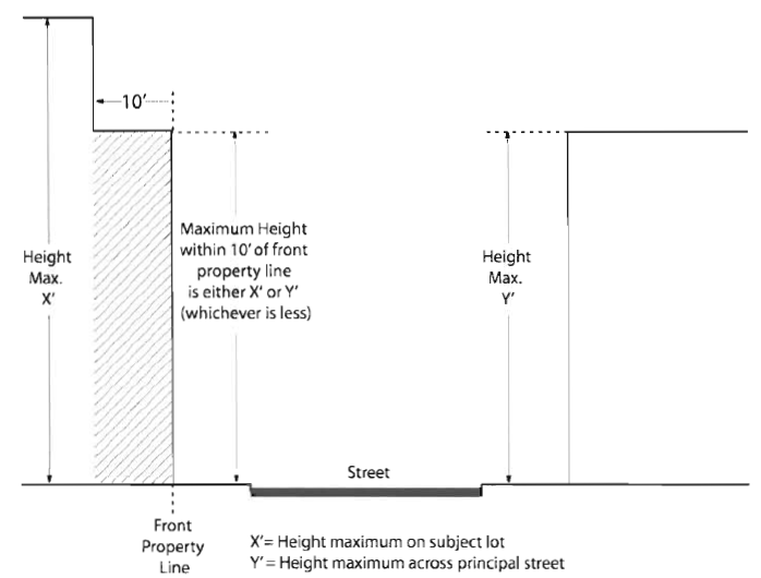 1. The maximum height within ten (10) feet of the front property line is either the height limit on the subject lot shown in the above table or the height maximum for the height area of the parcel directly across the principal street, whatever is less (see Illustration for Table 17.35.04 [Additional Regulation 1], below).