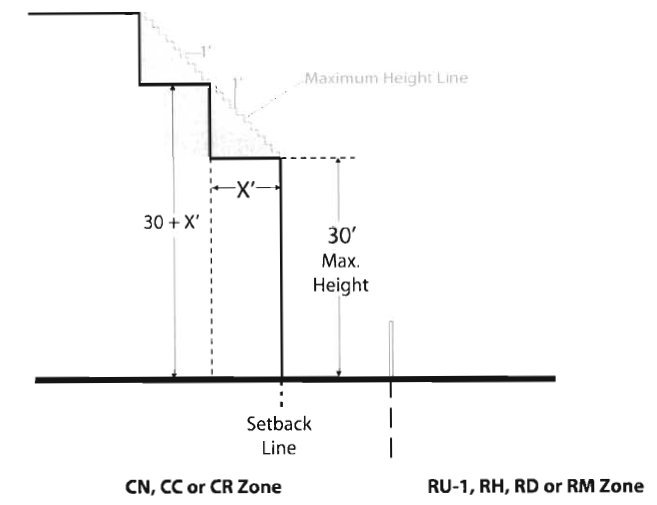 2. Buildings in the CC Zones shall have a thirty (30) foot maximum height at the setback line associated with any rear or interior side lot line that abut a lot in an RH, RD, or RM Zone; if the principal building on the abutting lot has a height of thirty (30) feet or less, this maximum height shall increase one foot for every foot of distance away from this setback line. If the principal building on the abutting lot has a height of greater than thirty (30) feet, the maximum height shall increase two (2) feet for every foot away from the applicable setback line (see Illustration for Table 17.35.04 [Additional Regulation 2], below). Also, see Section 17.108.030 for allowed projections above height limits and Section 17.108.020 for increased height limits in certain situations.