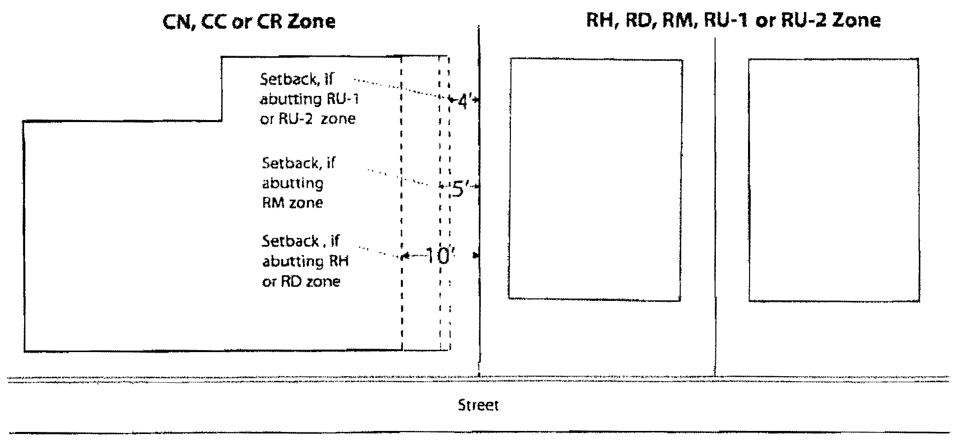 3. Wherever an interior side lot line abuts an interior side lot line of any lot located in an RH or RD Zone, a side setback of six (6) feet is required. In the case where an interior side lot line abuts an interior side lot line in an RM Zone, the setback of the abutting portion of its side lot line is five (5) feet. In the case where an interior side lot line abuts an interior side lot line of any lot located in an RU-1 or RU-2 Zone, a side setback of four (4) feet is required (see Illustration for Table 17.72.03 [Additional Regulation 4], below). Also, see Section 17.108.130 for allowed projections into setbacks.