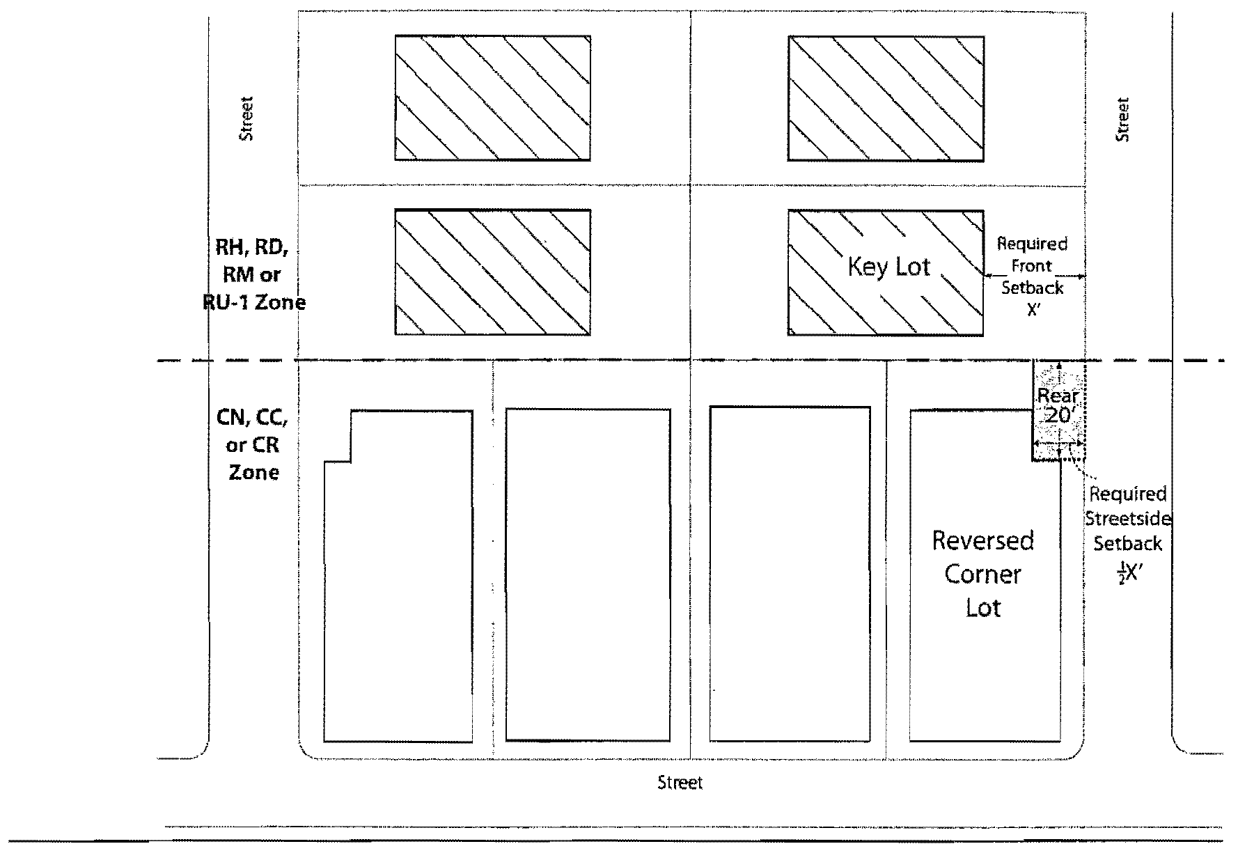 4. When the rear yard of a reversed corner lot abuts a key lot that is in an RH, RD, or RM Zone, the required street side yard setback in the rear ten (10) feet of the reversed corner lot is one-half (½) of the minimum front yard required on the key lot, but shall not be required to exceed four (4) feet in width if it would reduce to less than twenty-five (25) feet the buildable width of any corner lot (see Illustration for Table 17.72.03 [Additional Regulation 5], below). Also, see Section 17.108.130 for allowed projections into the setbacks.