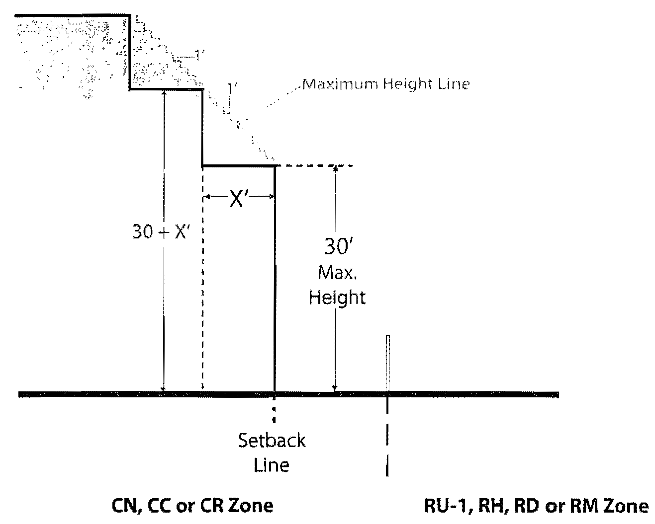 7. Buildings shall have a thirty (30) foot maximum height at the setback line associated with any rear or interior side lot line that abut a lot in an RH, RD, or RM Zone; if the principal building on the abutting lot has a height of thirty (30) feet or less, this maximum height shall increase one (1) foot for every foot of distance away from this setback line. If the principal building on the abutting lot has a height of greater than thirty (30) feet, the maximum height shall increase two (2) feet for every foot away from the applicable setback line (see Illustration for Table 17.72.03 [Additional Regulation 8, below). Also, see Section 17.108.030 for allowed projections above height limits and Section 17.108.020 for increased height limits for civic buildings.