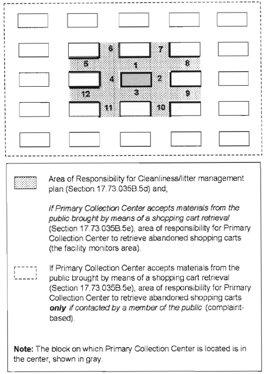 A site/immediate neighborhood shopping cart management plan shall be developed, implemented and maintained, such that it is ready for inspection. If the Primary Recycling Collection Center accepts materials from the public brought by means of a shopping cart, it shall be responsible for the retrieval of all shopping carts within the area comprised of all streets adjacent to the premises, and the one-block extension of those streets to the north and south, and east and west, respectively (See Figure 17.73.01). Additionally, a Primary Recycling Collection Center shall post signage that includes contact information to report abandoned shopping carts in the vicinity of the facility; if called or notified by a member of the public about abandoned shopping carts located within a two-block radius of the premises, a Primary Recycling Collection Center shall retrieve said carts. A two-block radius of the premises shall comprise all street sides of the twenty-five (25) square block area that includes the block on which the premises is located (as the center block of the twenty-five (25) square block area) See Figure 17.73.01).