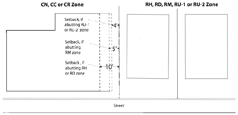 6. When a rear lot line is adjacent to an RH, RD, or RM Zone, the required rear setback for both Residential and Nonresidential Facilities is ten (10) feet. When a rear lot line is not adjacent to an RH, RD, or RM Zone, the required rear setback is ten (10) feet for Residential Facilities and there is no required setback for Nonresidential Facilities.
