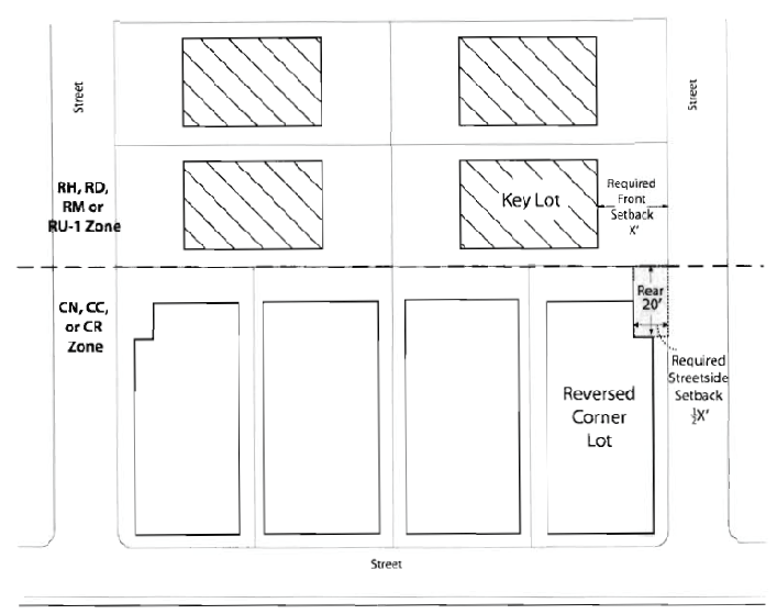 4. When the rear yard of a reversed corner lot abuts a key lot that is in an RH, RD, or RM Zone, the required street side yard setback in the rear ten (10) feet of the reversed corner lot is one-half (½) of the minimum front yard required on the key lot but shall not be required to exceed four (4) feet in width if it would reduce to less than twenty-five (25) feet the buildable width of any corner lot (see Illustration for Table 17.97.03 [Additional Regulation 4], below). Also, see Section 17.108.130 for allowed projections into setbacks.