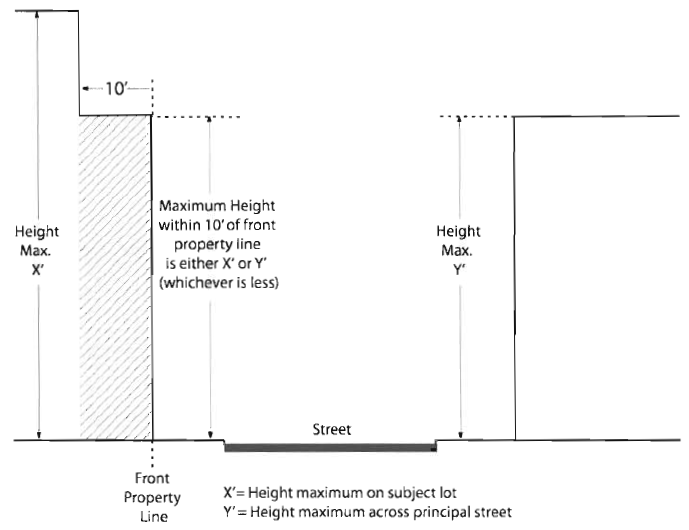 1. The maximum height within ten (10) feet of the front property line is either the height limit on the subject lot shown in the above table or the height maximum for the height area of the parcel directly across the principal street, whatever is less (see Illustration for Table 17.97.04 [Additional Regulation 1], below).