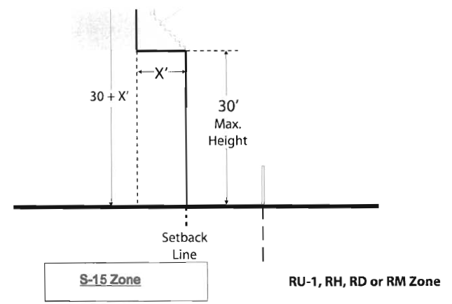 2. Buildings shall have a thirty (30) foot maximum height at the setback line associated with any rear or interior side lot line that abut a lot in an RH, RD, or RM Zone; if the principal building on the abutting lot has a height of thirty (30) feet or less, this maximum height shall increase one (1) foot for every foot of distance away from this setback line. If the principal building on the abutting lot has a height of greater than thirty (30) feet, the maximum height shall increase two (2) feet for every foot away from the applicable setback line (see Illustration for Table 17.97.04 [Additional Regulation 2], below). Also, see Section 17.108.030 for allowed projections above height limits and Section 17.108.020 for increased height limits in certain situations.