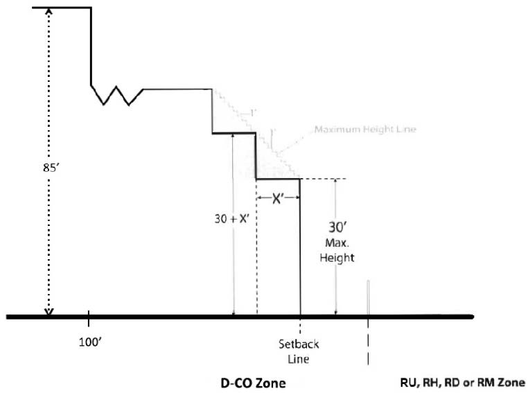 6. Buildings shall have a ninety-five (95) foot maximum height when located within one hundred (100 feet) of any lot line that abuts a lot in a RH, RD, RM, RU, or S-15 Zone. In addition, buildings shall have a thirty (30) foot maximum height at the setback line associated with any rear or interior side lot line that abuts a lot in a RH, RD, RM, or RU Zone; if the principal building on the abutting lot has a height of thirty (30) feet or less, this maximum height shall increase one (1) foot for every foot of distance away from this setback line. If the principal building on the abutting lot has a height of greater than thirty (30) feet, the maximum height shall increase two (2) feet for every foot away from the applicable setback line (see Illustration for Table 17.101H.03 [Additional Regulation 6], below). Also, see Section 17.108.030 for allowed projections above height limits and Section 17.108.020 for increased height limits in certain situations.