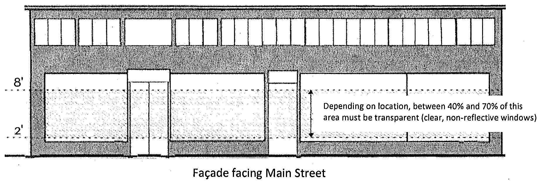 16. The minimum percent transparency for the band between two (2) feet and eight (8) feet in height of any side of a commercial building facing a Principal Drive is forty percent (40%). The minimum percent transparency for the band between two (2) feet and eight (8) feet in height of any side of a commercial building facing a retail plaza is seventy percent (70%). An example of glazing treatment that meets these requirements is illustrated in the figure below: