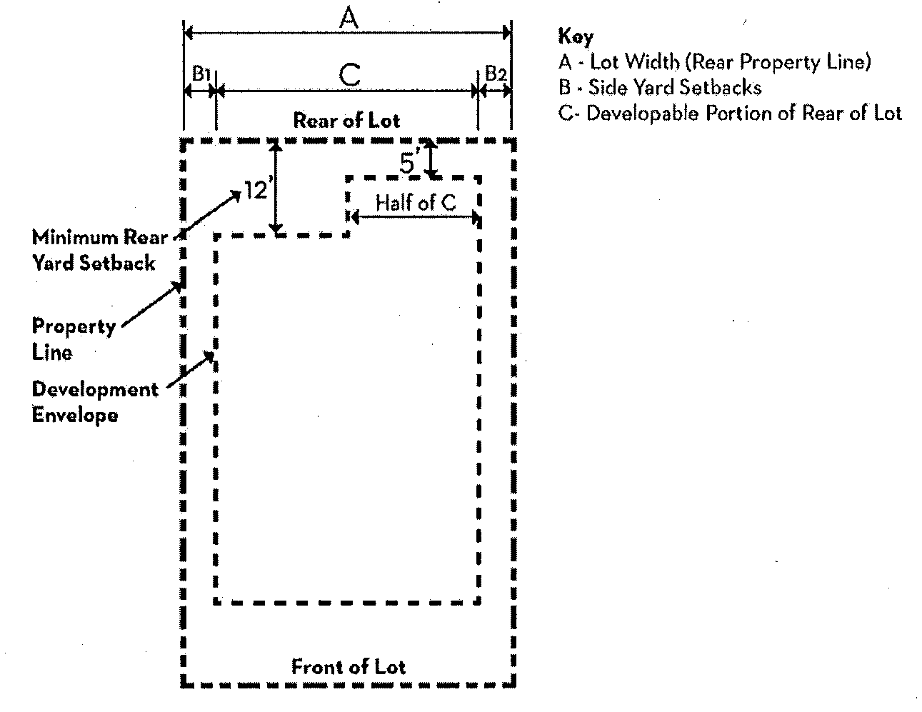 9. In the D-OK-2 Zone, the minimum rear setback can be reduced to five (5) feet over a maximum of one-half (½) the width of the developable portion of the lot (i.e., the width not including the applicable side yard setbacks), as shown in the following figure. In the D-OK-4 Zone, there is no minimum rear setback unless the rear lot line is adjacent to a Residential Zone, in which case the rear setback is five (5) feet.