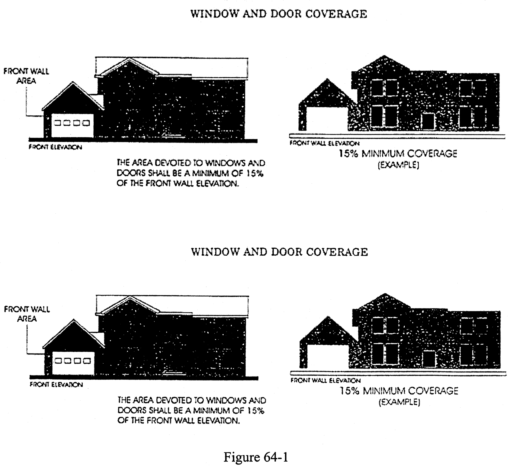Window and door coverage. All elevations of a single-family residential dwelling and of an accessory building including without limitation, front, side, and rear elevations, shall devote a minimum of 15 percent of their wall coverage to window and door coverage. Figure 64-1 shows an example of this for a front elevation.