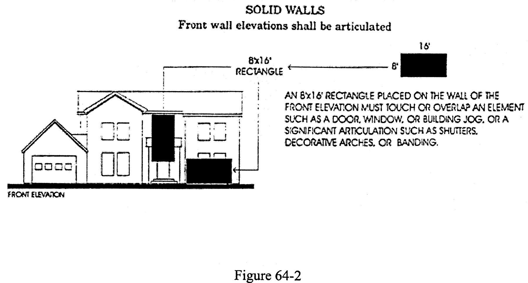 Substantial articulation. In addition to the 15 percent window and door coverage on all elevations of a single-family residential dwelling and an accessory building including without limitation, front, side, and rear elevations, there shall be other signification articulation on all elevations such that the placement of an eight foot by 16 foot rectangle on the wall of the elevation must touch or overlap an element such as a window or door, or a significant articulation such as shutters, decorative arches, building jog, or banding. Figure 64-2 shows an example of this for a front elevation.